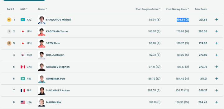 {jz:field.toptypename/}沙伊多罗夫以短节目第五名晋级决赛,凭借解放滑5个四周跳的无缺阐述零首要失实,总分291.58分爆冷夺金;他在短节盘算得分198.64,排行第一。