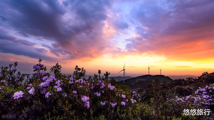 长海子风车群,白色风车与杜鹃花同框,若命运好可遇“草原佛光”。