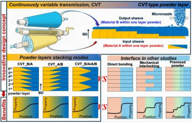 图1 受CVT启发的粉末千里积策略暗示图,该策略用于在多材料LPBF中制备光滑连气儿的水平梯度界面。该见解通过对接两种不同材料的互补厚度梯度,杀青了单层粉末内的因素过渡,与传统界面狡计比拟,或者杀青不同材料之间更光滑、更连气儿的过渡。