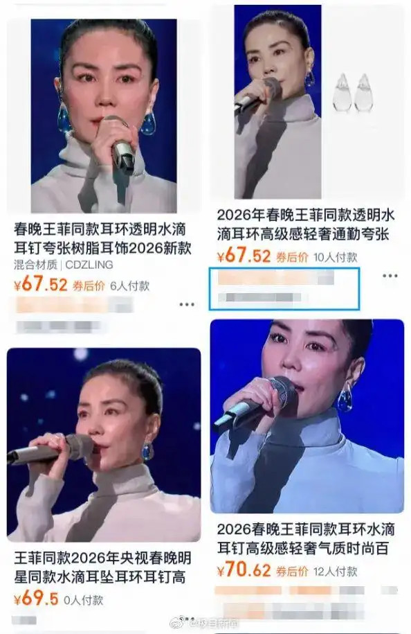 17日,@极目新闻 记者在电商平台搜索发现,多款标注 “2026 春晚王菲同款水点耳饰” 的仿款已有商家开售。从商品页面来看,这些仿款多给与树脂等平价材质,订价聚拢在29元至135元之间,开售不久已非凡十东谈主付款。